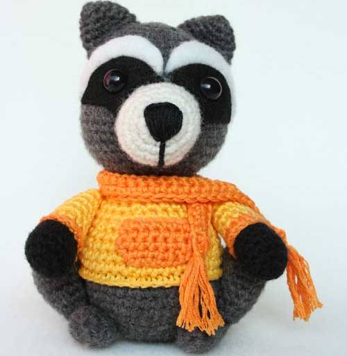 Вязаный енот амигуруми в ярком свитере. Смотрите описание вязания на "Стране увлечений".